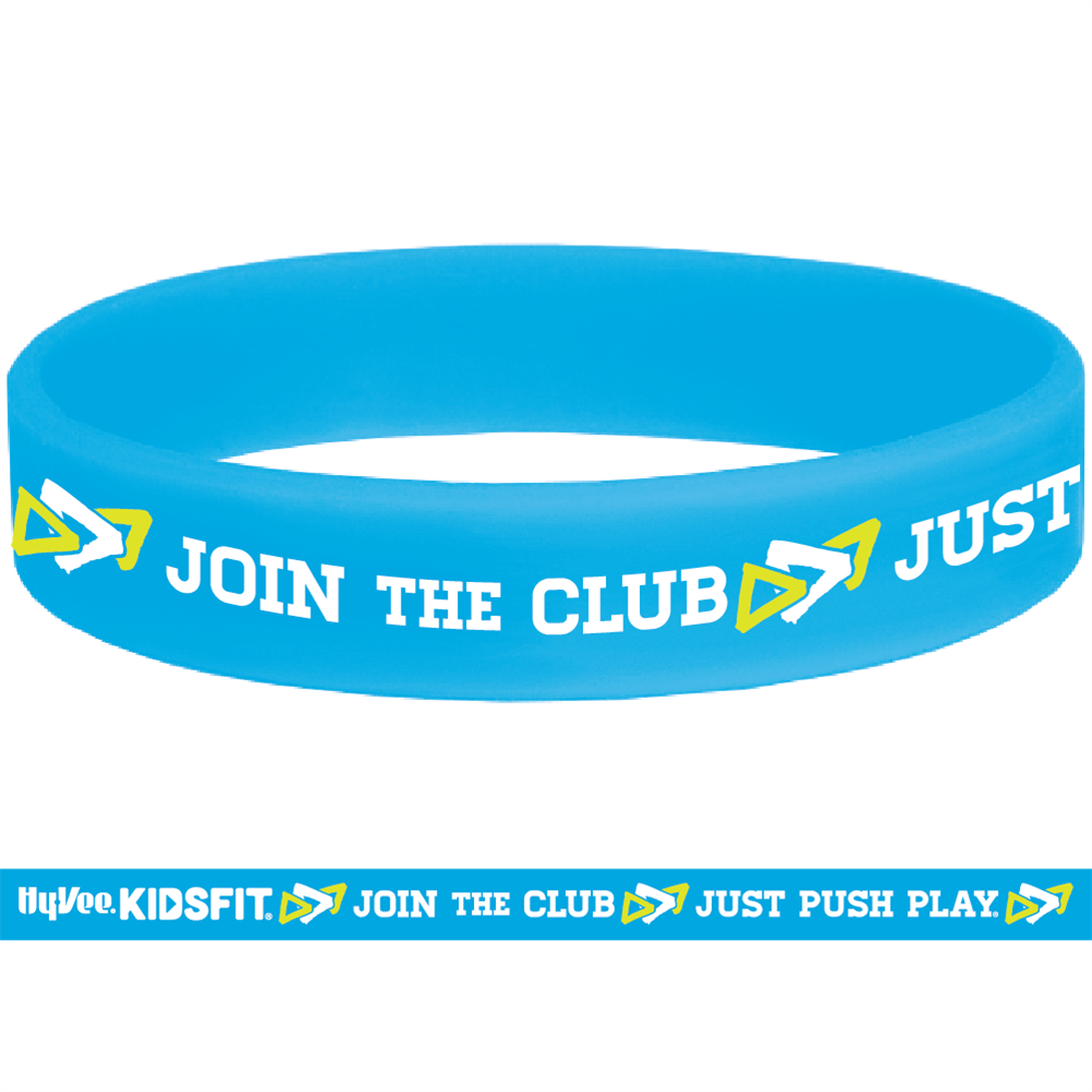 Bracelet is blue with the Hy-Vee KidsFit Join the Club Just Push Play logo imprinted on one side.